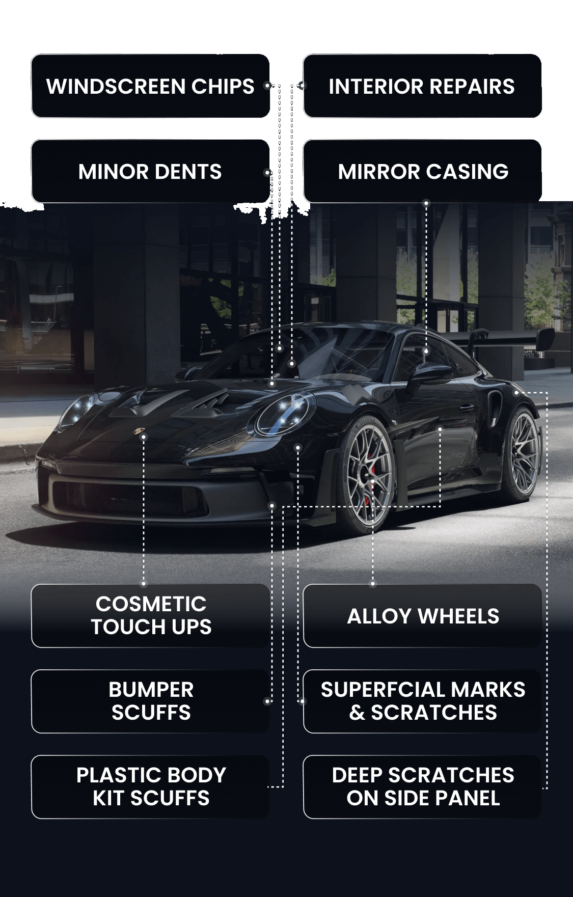Bumper Scrapes, Windscreen chips, interior repairs, wheel repairs, deep scratches, dents, light scratches. Our programs cover the every day bumps and scratches on your vehicle, see vehicle diagram and terms and conditions for size limits